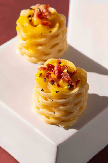 Il progetto diventa sintesi tra estetica, funzione e gestualità quotidiana. «Ci siamo dovuti inventare un modo per fare un formato di pasta che durante la cottura non si rompesse. Abbiamo analizzato tantissime variazioni di spaghetto 3D e abbiamo trovato quella che usiamo adesso come standard, che in realtà è un tagliolino, perché nel mondo gourmet la texture della pasta molto fina aiuta a percepire meglio un sugo molto ricco».