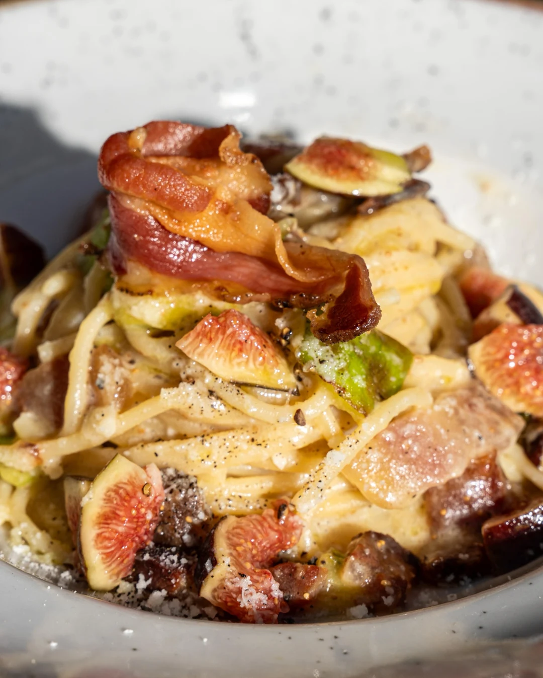Ma il piatto che attendevo con maggiore curiosità è la gricia con i fichi. Ettore mi racconta che prima di arrivare alla ricetta definitiva hanno provato più volte: «la chiave era il fico. Dovevamo metterlo fresco, a pezzi, direttamente nel piatto. Se lo passavamo in padella, perdeva la sua freschezza e diventava troppo dolce».